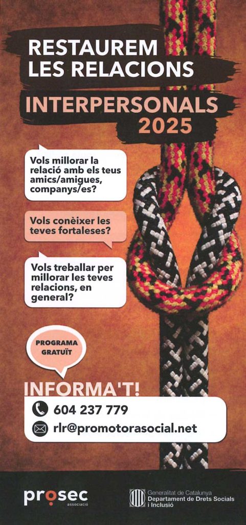 Restaurem les Relacions Interpersonals és una iniciativa de la nostra entitat dirigida a joves d’entre 14 i 17 anys i finançada pel Departament de Drets Socials i Inclusió de la Generalitat de Catalunya.